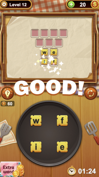 The game interface is intuitive and elegantly designed. The remaining time is displayed in the bottom-right corner of the screen, while the main gameplay area in the center contains the movable and connectable letter tiles. Players must combine as many words as they can within the allotted time to earn high scores. If players encounter difficulties, the game offers a hint feature that can help them discover potential word combinations.